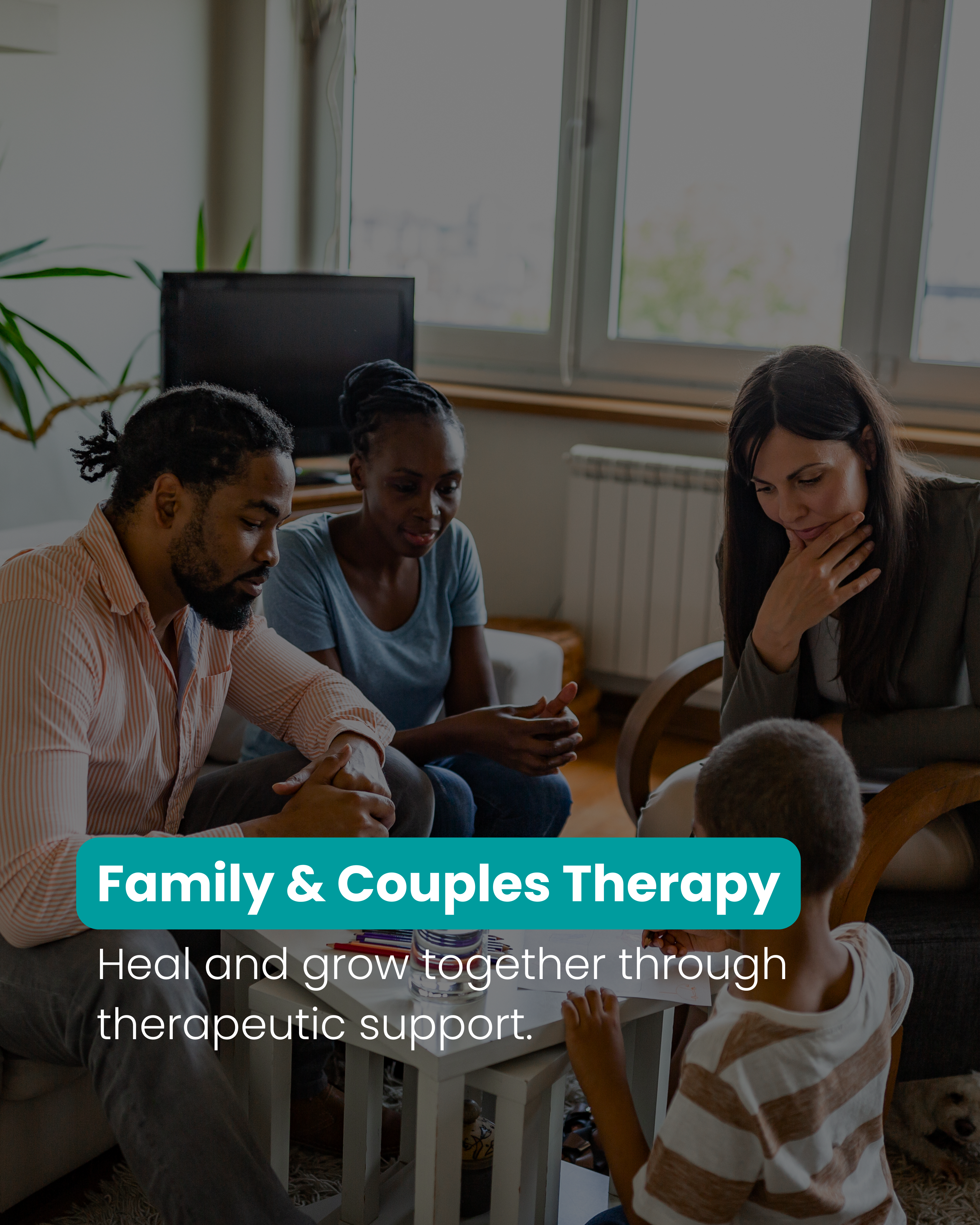 We provide individual, family, couples, and group therapy. Our services include evidence-based approaches such as Cognitive Behavioral Therapy (CBT), trauma-informed care, and emotional wellness programs.